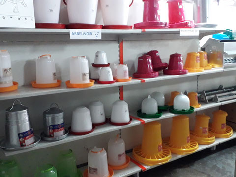 Nourrisseurs, abreuvoirs, poulaillers, cages, enclos, grillages, filets, lampes, ampoules...